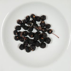 Récoltées à peine mûres, les baies sont fermentées (d’où la teinte noire) puis séchées.